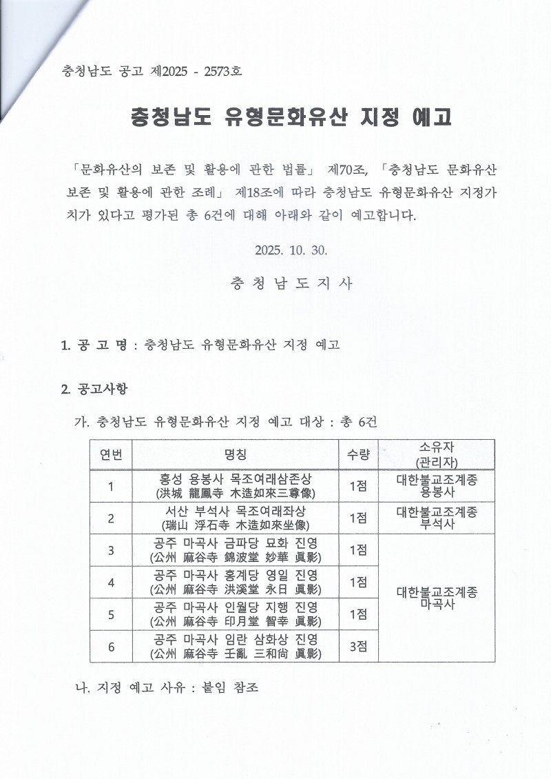 우리 절 극락전에 모셔진 <목조아미타여래좌상>이 충청남도 유형문화유산 지정 예고되었습니다. 앞으로 극락전. 심검당. 무량수각. 안양루에 대한 문화유산 등재를 위해 더욱 노력하겠습니다.