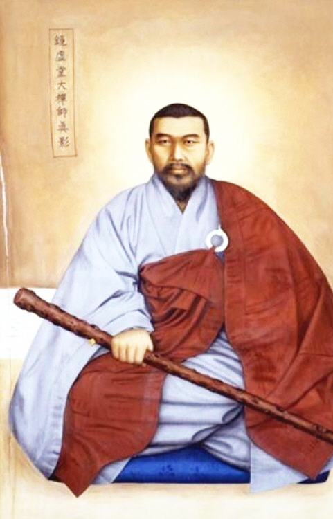 경허(鏡虛)스님은 한국불교의 중흥조로 평가되는 근현대 불교를 개창(開創)한 대선사입니다.스님의 속명(俗名)은 동욱(東旭), 법명은 성우(性牛), 법호는 경허(鏡虛)입니다. 본관은 여산(廬山)으로 1849년 전주 자동리에서 부친 송두옥(宋斗玉)과 모친 밀양 박씨의 차남으로 태어났습니다. 9세때 경기도 과천 청계사(淸溪寺)로 계허(桂虛)스님을 은사로 출가하였습니다. 이때, 절에 있던 거사에게 사서삼경을 배우고 기초적인 불교교리(佛敎敎理)를 익혔습니다. 이후 스님은 당시 동학사 강백( 講伯)인 만화(萬化)스님에게 천거되어 불교경론을 배웠습니다. 23세에 스승인 만화스님의 뒤를 이어 동학사 강백으로 추대되어 후학을 양성하였습니다.어느 날 전염병이 돌고 있는 마을에서 사람들의 죽음을 보고 문자 공부가 죽음에 대한 두려움을 없애주지 못한다는 것을 깨닫게 되었다고 합니다. 그 후 오로지 영운(靈雲) 선사의 「驢事未去馬事到來 나귀의 일이 끝나지 않았는데 말의 일이 닥쳐왔다.」는 화두를 들고 정진하였습니다. 그러나 화두는 해석도 되지 않고 은산철벽(銀山鐵壁)에 부딪혀 괴로워할 때 「소가 되어도 고삐 뚫을 구멍이 없다.」는 아랫마을 이처사(李處士)의 말을 듣고 확철대오((廓徹大悟)하니 1879년 34세 때였습니다. 1880년 봄에 연암산 천장사에 들어가 보림(保任)에 들어가니 이듬해 6월 활연대오(豁然大悟)하여 오도가(悟道歌)를 불렀습니다.